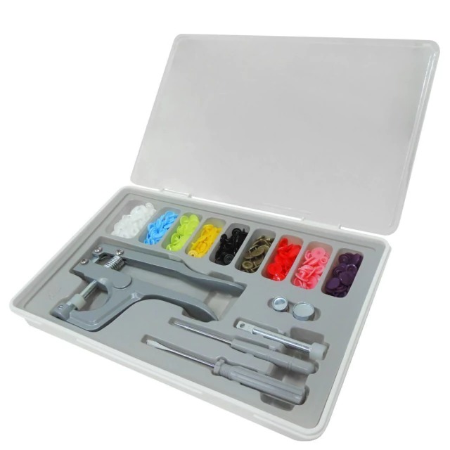 Kit para Aplicação de Botões de Pressão, uma solução prática e completa para aplicar botões de pressão em roupas e acessórios com agilidade e precisão. Com alicate 3 em 1, este kit é ideal para diferentes tamanhos de botões (T3, T5 e T8), oferecendo acabamentos profissionais em diversos tecidos. Leve e portátil, é perfeito para uso em casa ou pequenos negócios.