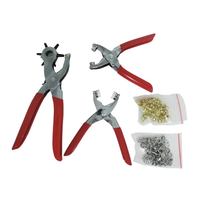 - Multifuncionalidade: Inclui três alicates específicos para diferentes funções: furar, aplicar ilhós e botões de pressão.