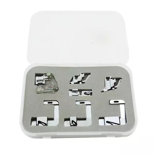 Kit de Pé Sapatas e Calcadores para Barra, Bainha e Viés CY007 da Westpress, perfeito para costureiros e entusiastas que buscam acabamentos profissionais. Inclui 7 peças especializadas para bainhas, viés e barras, elevando a qualidade de seus projetos.
