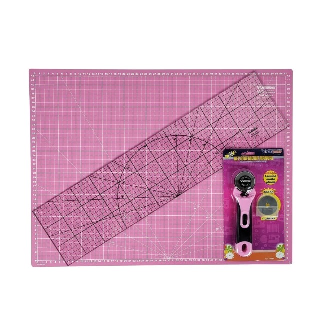O Kit de Base de Corte Rosa com Cortador e Régua é a escolha ideal para quem busca precisão e praticidade em projetos de costura, patchwork, scrapbook e artesanato. Com marcações em centímetros, polegadas, graus e ângulos, a base de corte facilita a realização de cortes exatos e detalhados. O kit inclui ainda um cortador circular de 45 cm com lâmina extra e uma régua de 15 x 60 cm, completando as ferramentas essenciais para seus trabalhos manuais.